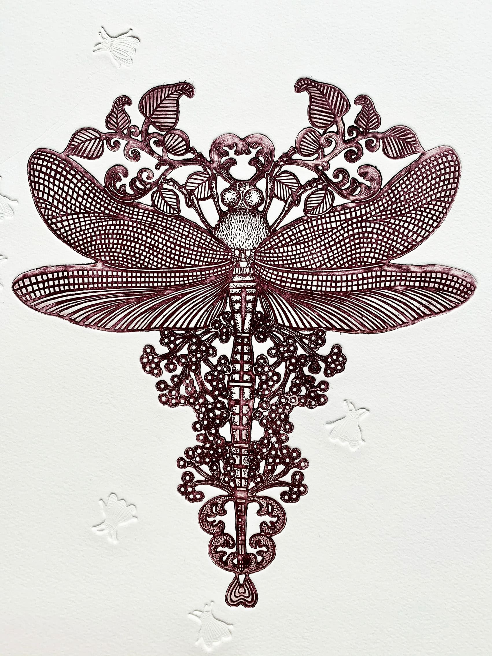 Michaël Cailloux réinvente la gravure à l’eau-forte en découpant ses plaques de cuivre à la scie bocfil, libérant ainsi la composition de tout cadre traditionnel. Alliant maîtrise de la pointe sèche et expérimentation, il compose des univers foisonnants où volutes végétales et figures animales dialoguent dans une scénographie frontale et immersive. Par le jeu des « varia », chaque estampe devient une œuvre singulière, magnifiée par des encrages subtils et des papiers d’exception.