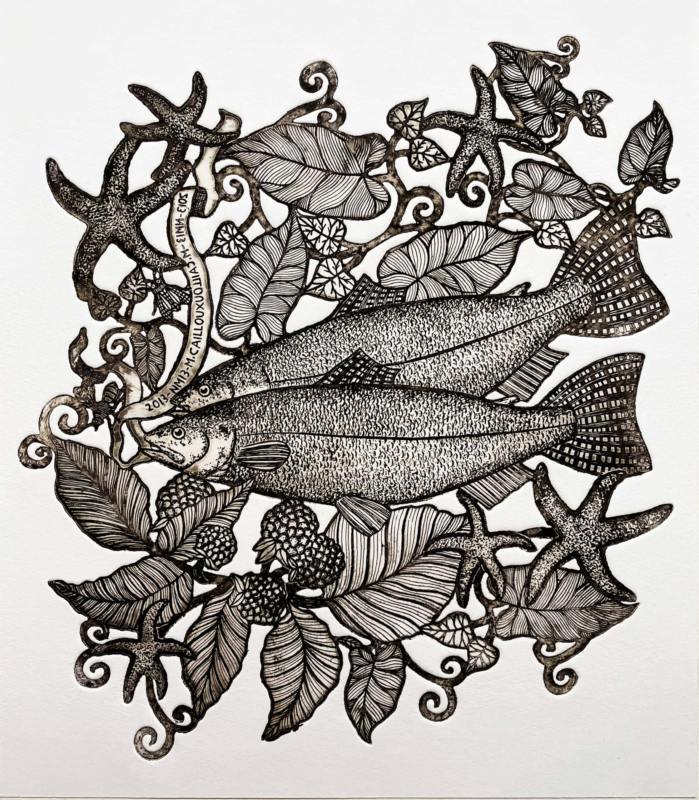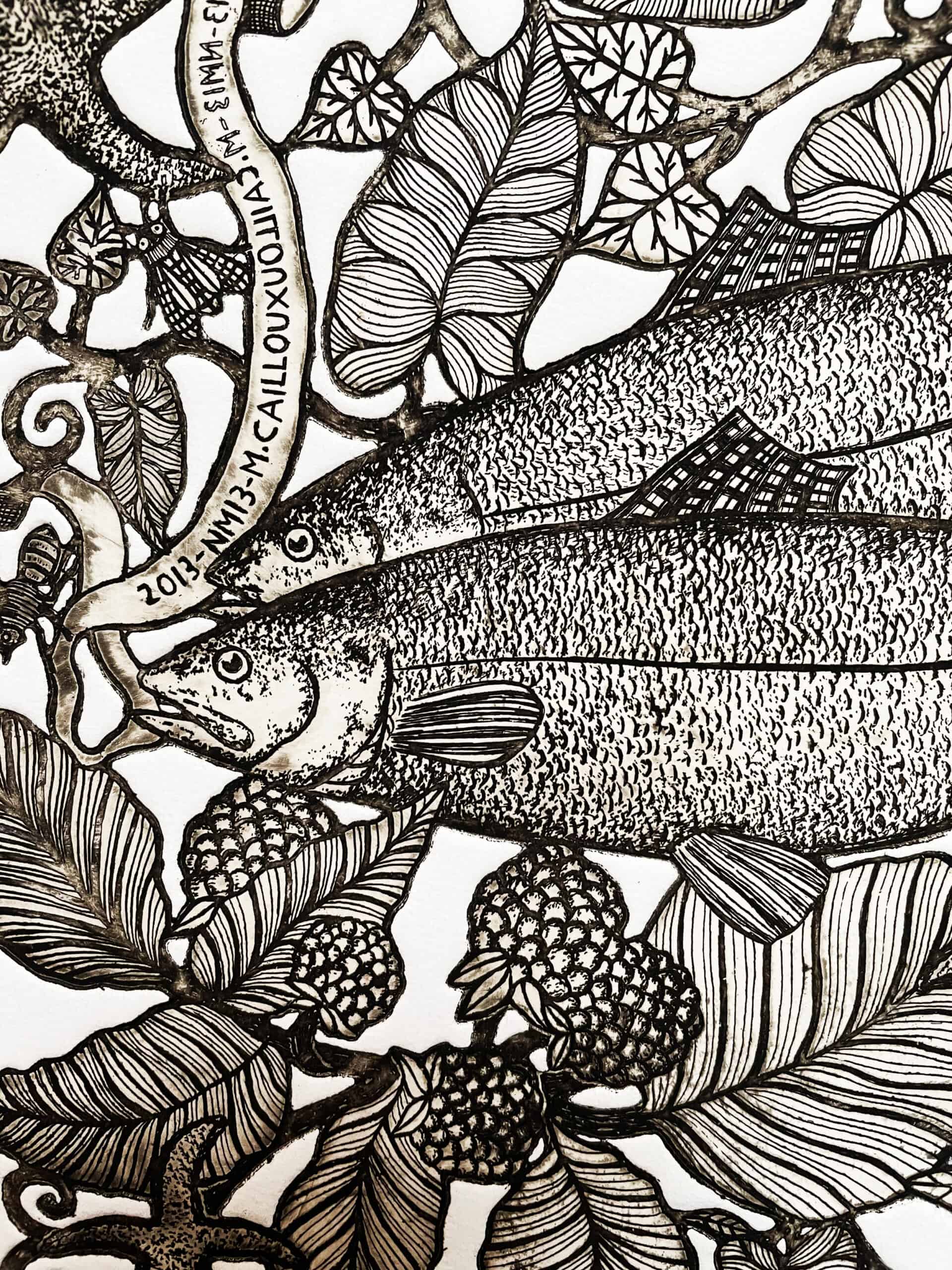 Michaël Cailloux réinvente la gravure à l’eau-forte en découpant ses plaques de cuivre à la scie bocfil, libérant ainsi la composition de tout cadre traditionnel. Alliant maîtrise de la pointe sèche et expérimentation, il compose des univers foisonnants où volutes végétales et figures animales dialoguent dans une scénographie frontale et immersive. Par le jeu des « varia », chaque estampe devient une œuvre singulière, magnifiée par des encrages subtils et des papiers d’exception.