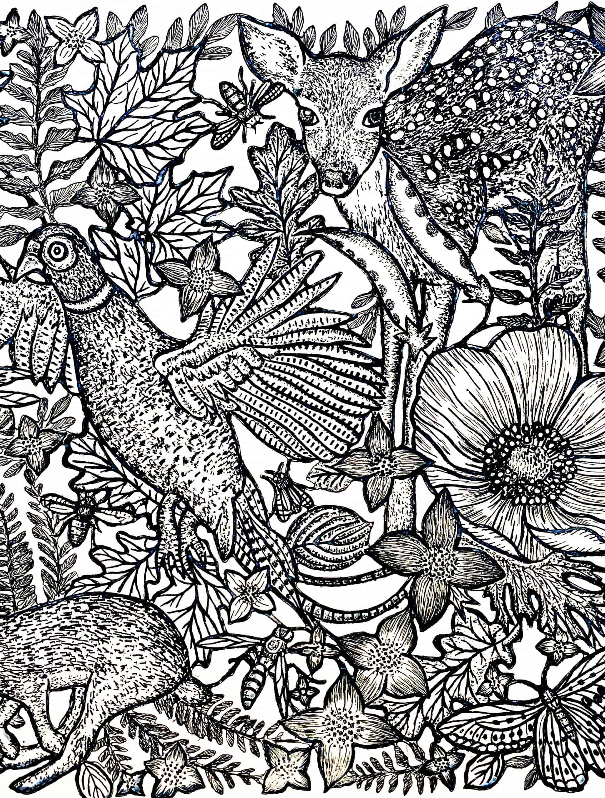 Michaël Cailloux réinvente la gravure à l’eau-forte en découpant ses plaques de cuivre à la scie bocfil, libérant ainsi la composition de tout cadre traditionnel. Alliant maîtrise de la pointe sèche et expérimentation, il compose des univers foisonnants où volutes végétales et figures animales dialoguent dans une scénographie frontale et immersive. Par le jeu des « varia », chaque estampe devient une œuvre singulière, magnifiée par des encrages subtils et des papiers d’exception.