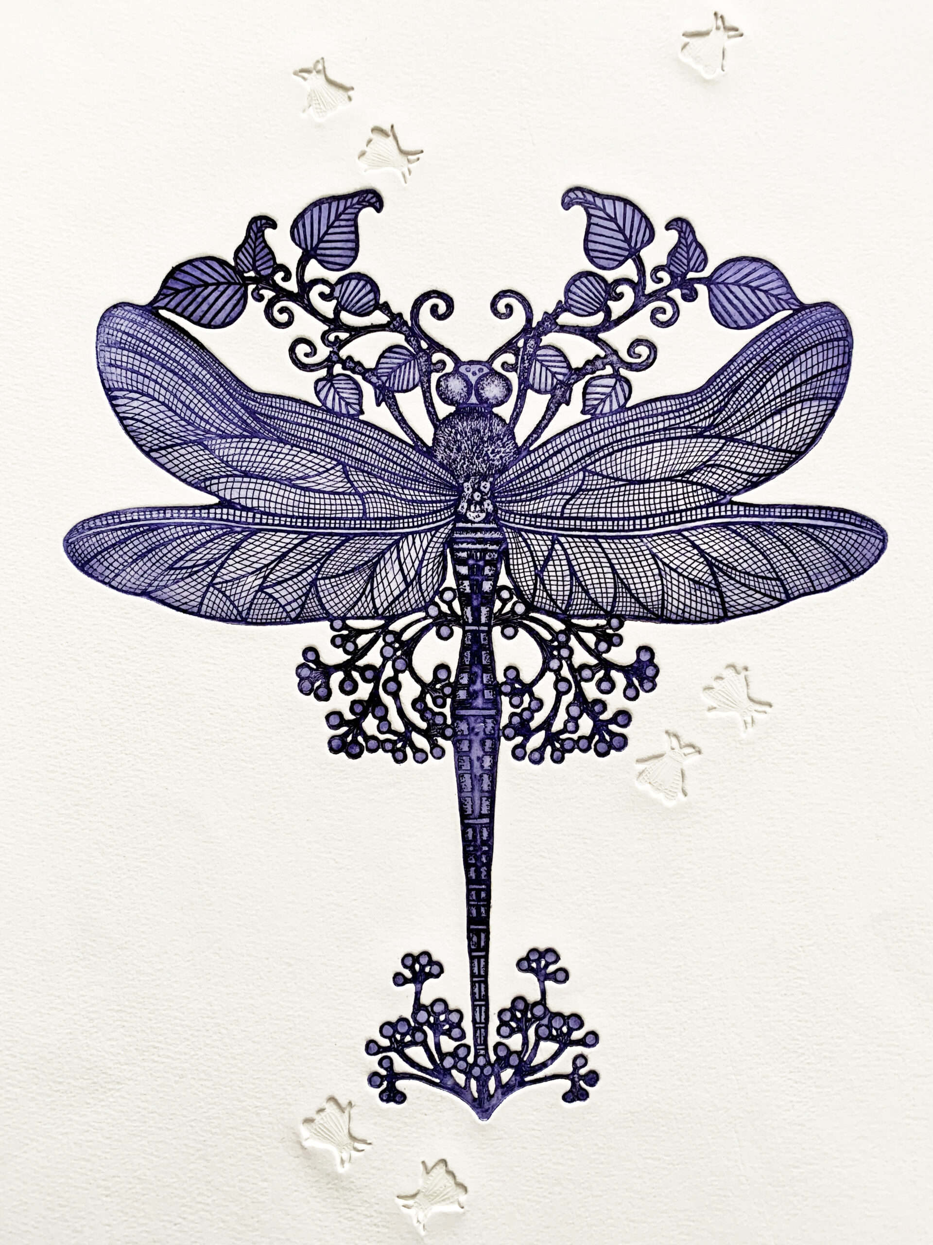 Michaël Cailloux réinvente la gravure à l’eau-forte en découpant ses plaques de cuivre à la scie bocfil, libérant ainsi la composition de tout cadre traditionnel. Alliant maîtrise de la pointe sèche et expérimentation, il compose des univers foisonnants où volutes végétales et figures animales dialoguent dans une scénographie frontale et immersive. Par le jeu des « varia », chaque estampe devient une œuvre singulière, magnifiée par des encrages subtils et des papiers d’exception.