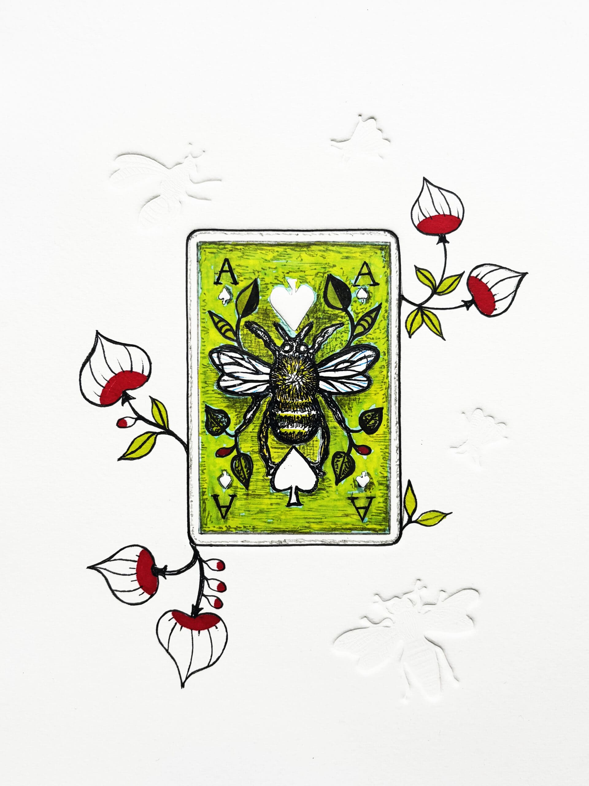 En 2025, Michaël Cailloux imagine une série de gravures à l’eau-forte autour du jeu de cartes. Chaque œuvre prend la forme d’un As, minutieusement gravé et rehaussé à la main, au centre duquel s’épanouit un insecte. Des cartes messagères de chance, à contempler et à garder près de soi. Avec cette série, l’artiste joue avec l’idée de la carte comme porte-bonheur, et invite à mêler hasard, espoir et poésie.