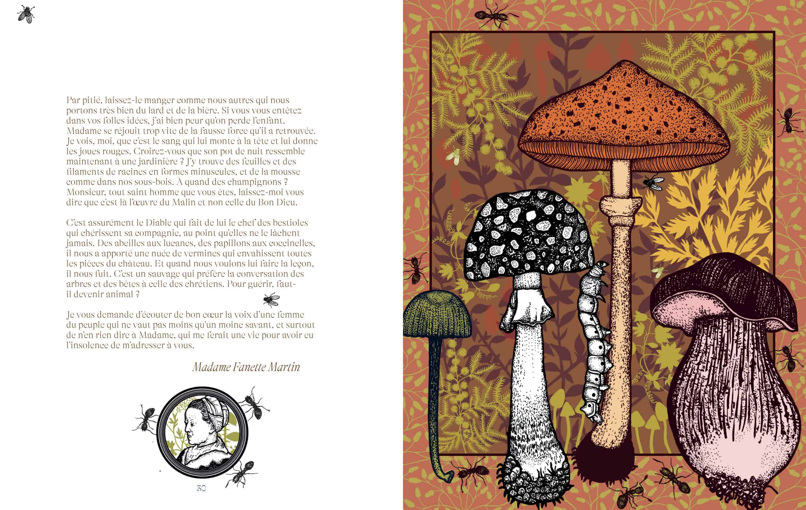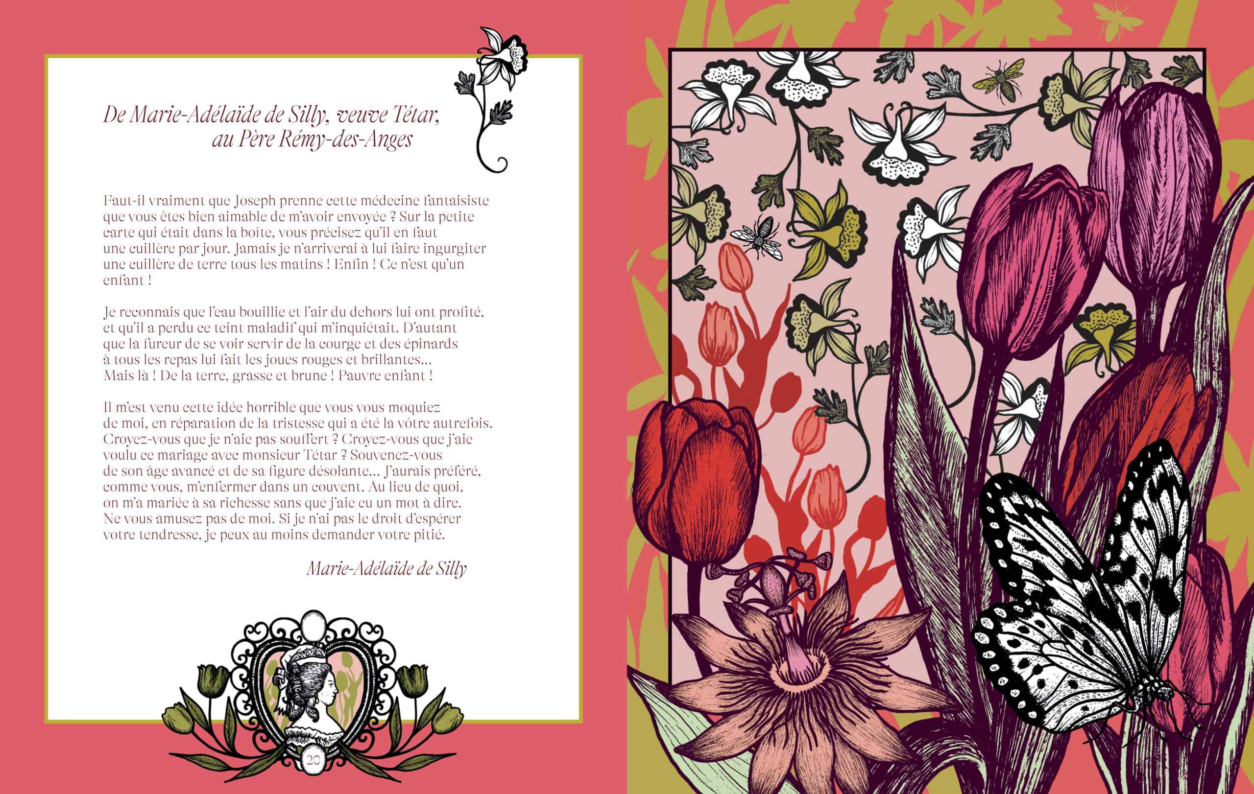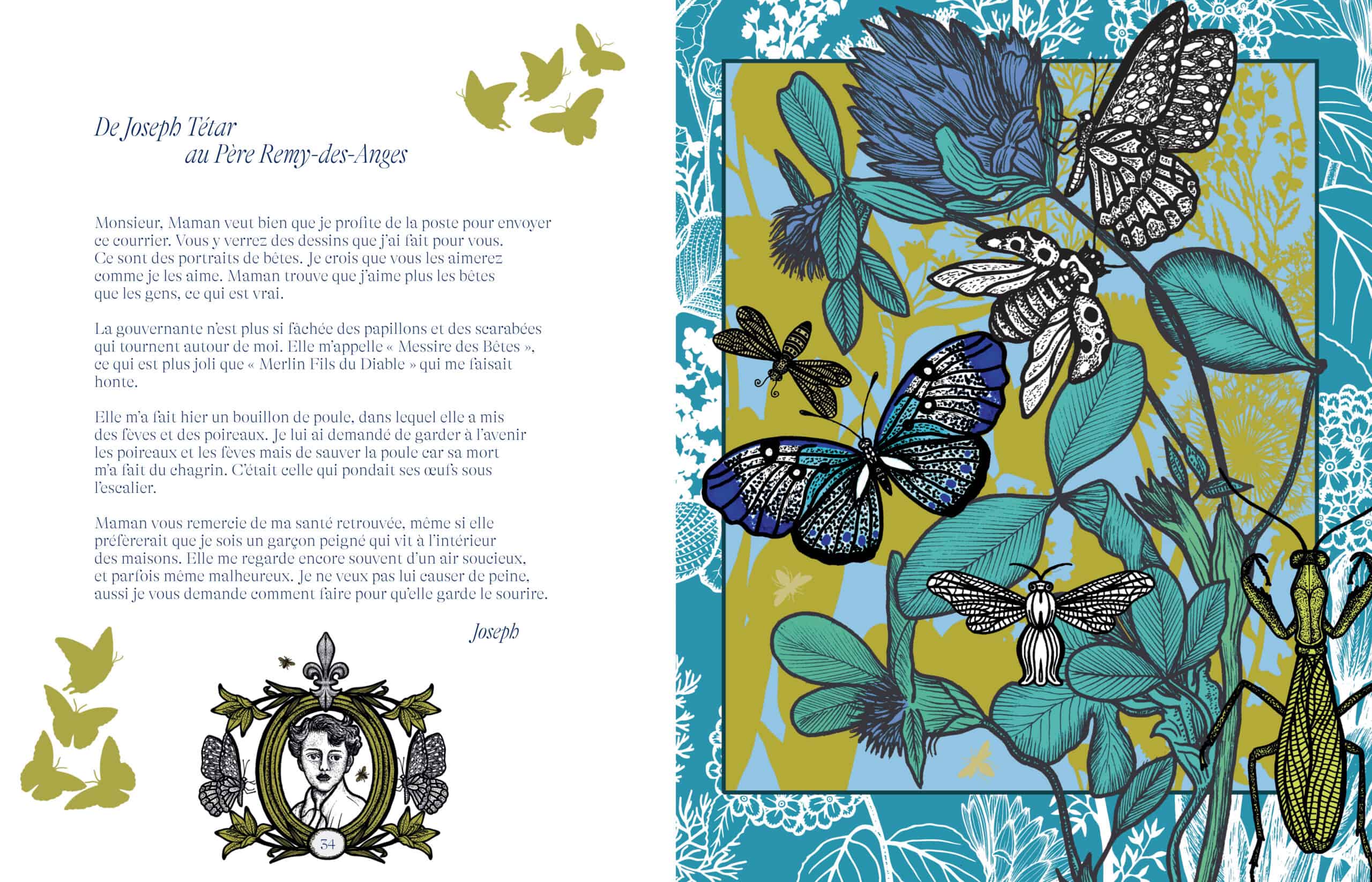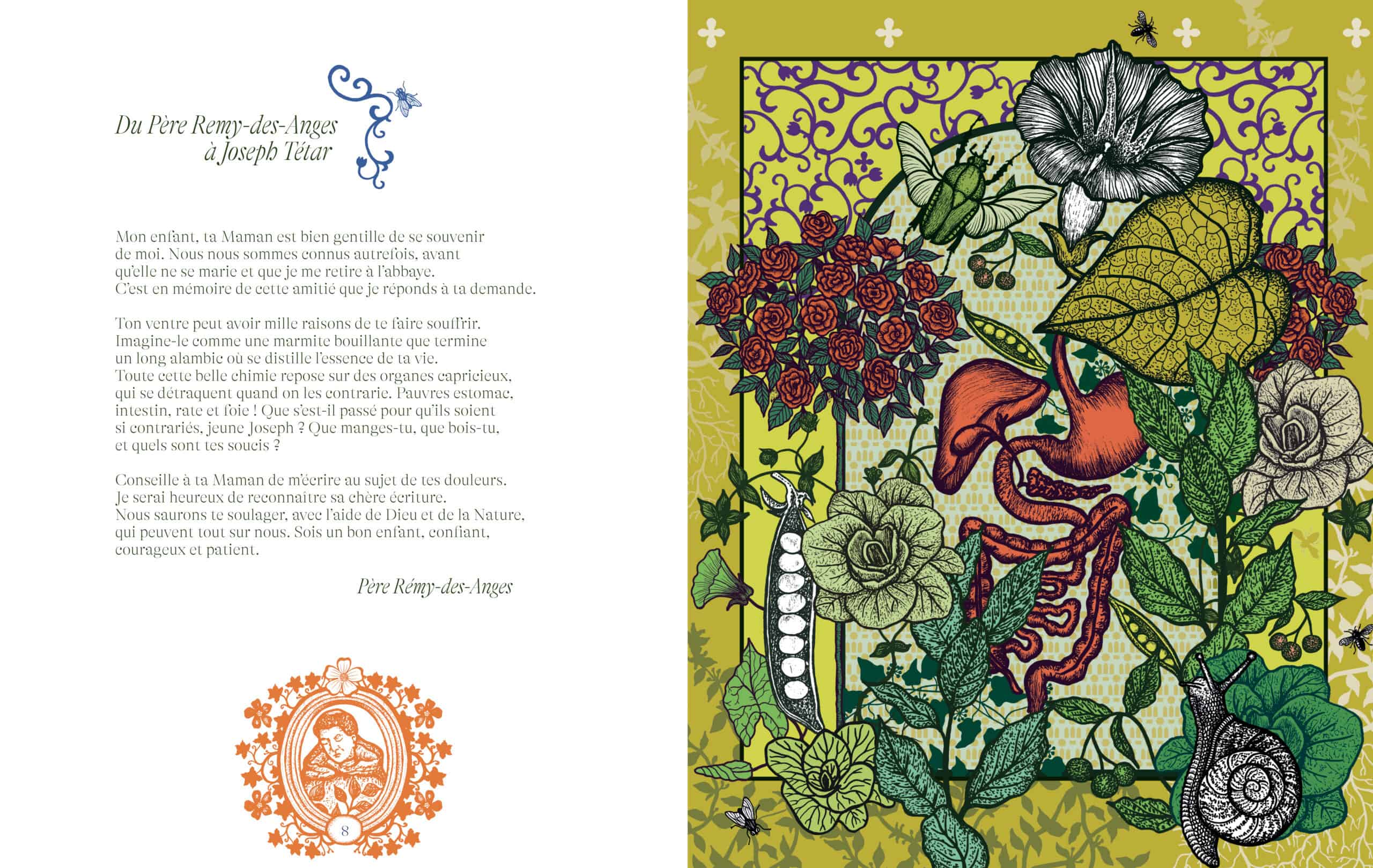 Avec Le ventre de Joseph, Michaël Cailloux s’associe à Marie Desplechin pour créer un album où l’harmonie entre le texte et les illustrations crée une atmosphère riche et envoutante. Ses dessins, réalisés au feutre fin, s’inspirent de l’univers des enluminures médiévales et des planches botaniques anciennes. À travers ses compositions détaillées, il parvient à retranscrire la poésie et la complexité du XVIIIe siècle, en travaillant notamment sur des entrelacs végétaux et animaliers. Ce travail minutieux, aux lignes précises et aux jeux de plans, s’inscrit dans une démarche artistique raffinée qui fait écho à ses influences classiques et à son exploration des techniques traditionnelles, telles que la gravure.