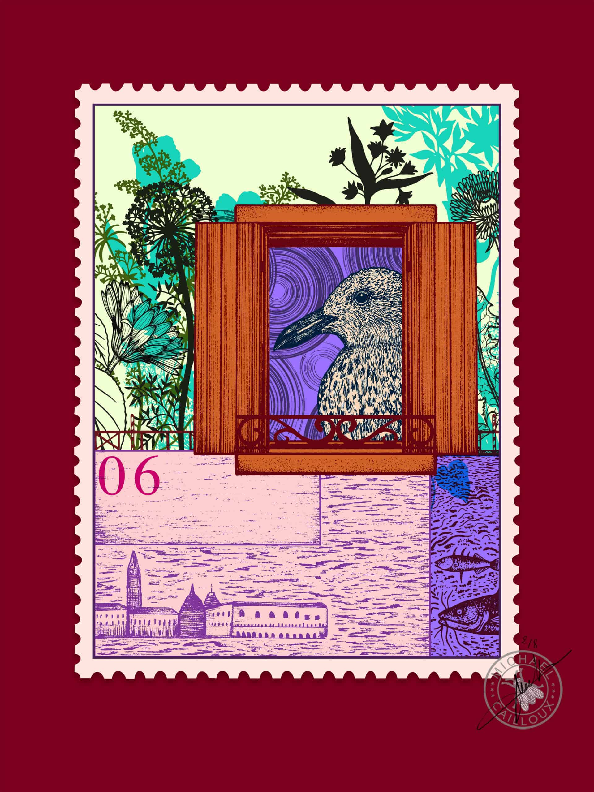 Dans la série Correspondance (2025), Michaël Cailloux transforme le timbre en tableau pour réveiller un souvenir de Venise. Ici, la carte postale rêvée se déploie en grand format, comme une échappée suspendue entre mémoire et imaginaire. Signé, numéroté et limité à huit exemplaires seulement, ce tirage rare s’inscrit dans une collection de onze destinations, pensées comme autant de fragments d’ailleurs à contempler et à collectionner.