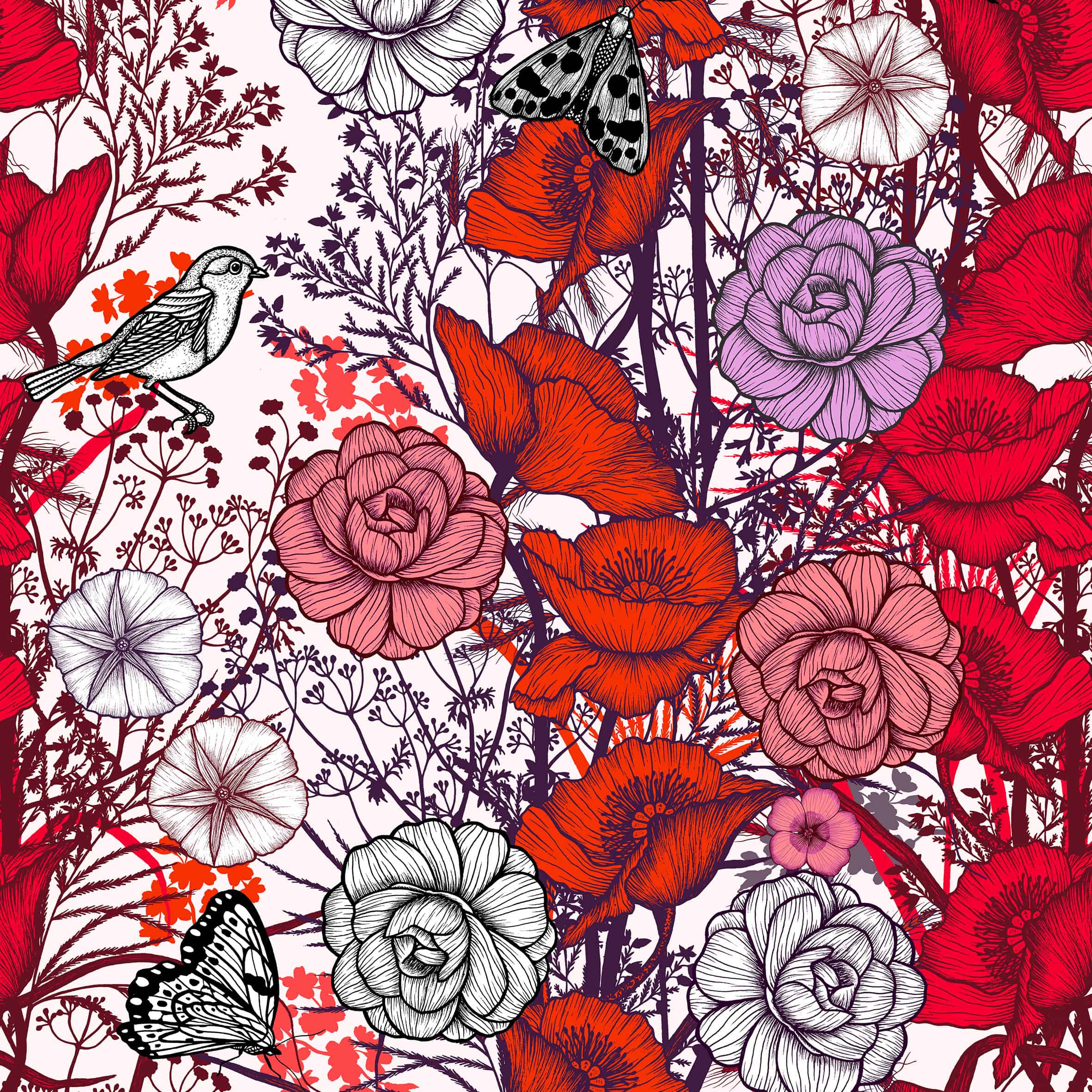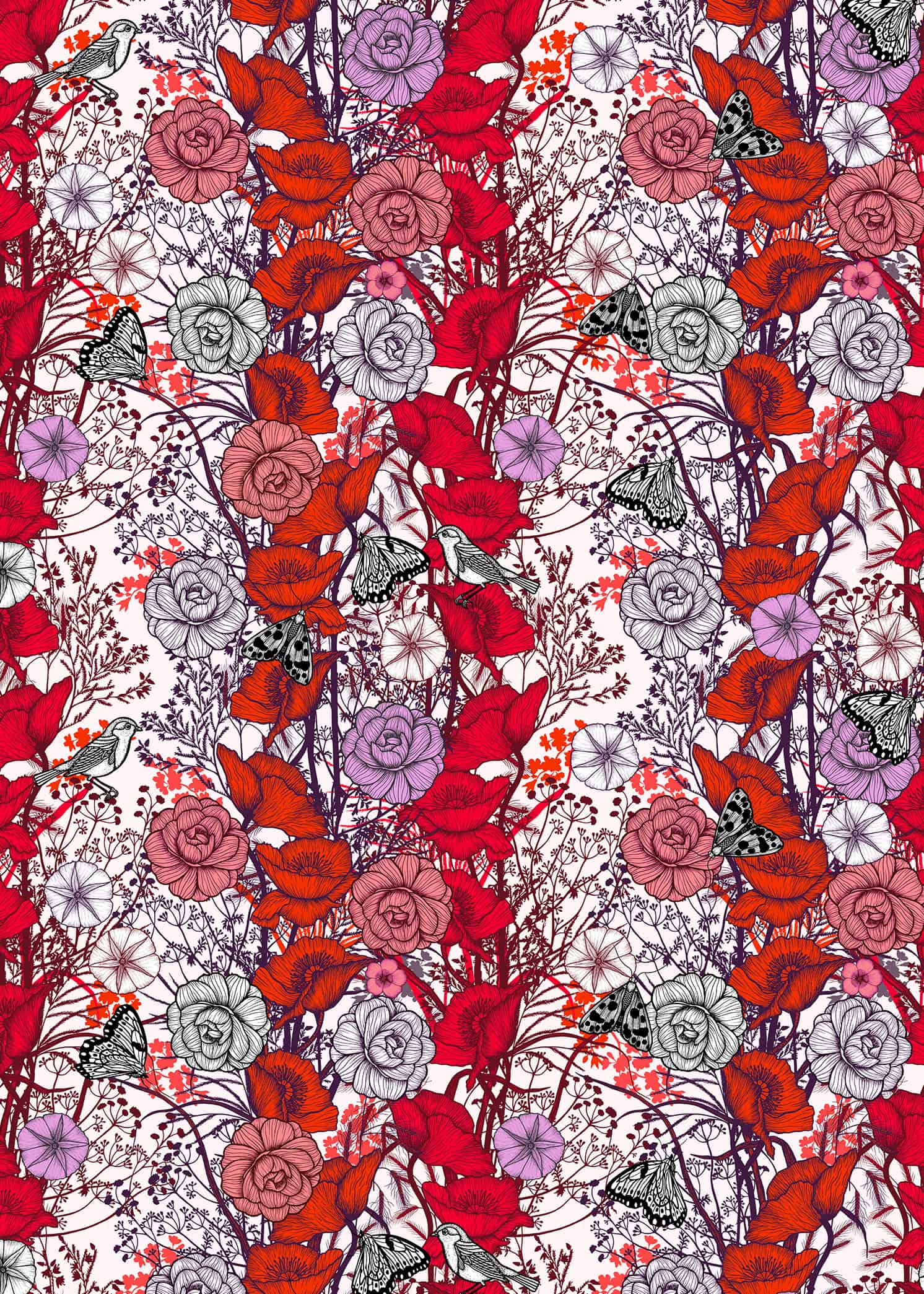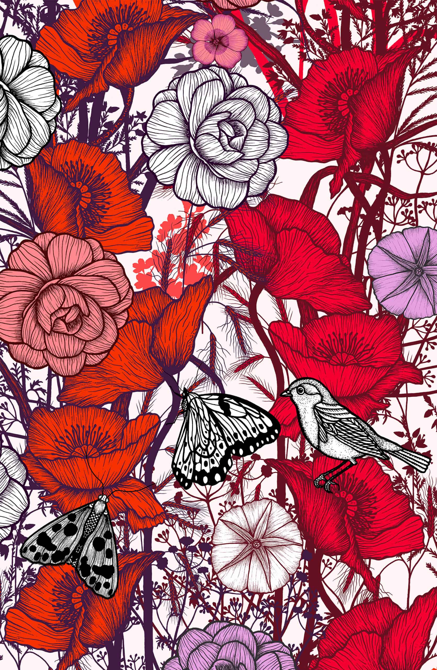 Un éclat de rouge, une éclosion de vie. Les fleurs s’épanouissent en une danse infinie, tandis que les oiseaux glissent entre les pétales, messagers d’un monde libre. Ici, la nature se dévoile sans retenue, dans un écrin de liberté, un véritable jardin sauvage.