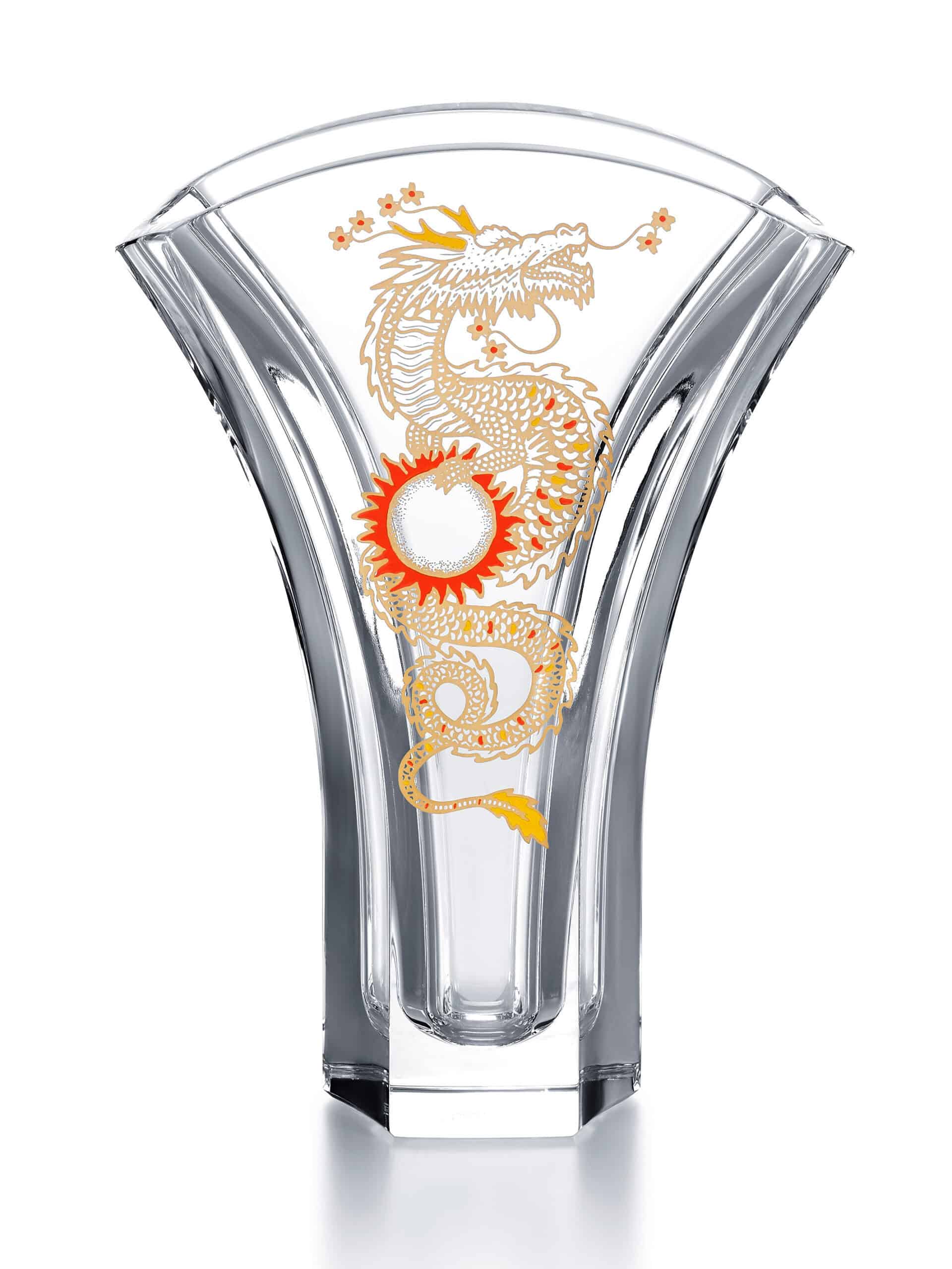 Au cœur de la collection, le vase Solar Dragon se distingue par sa silhouette en demi-éventail et ses décors vibrants. Les motifs de l’artiste mêlent le rayonnement solaire, les fleurs de cerisier et les écailles scintillantes du dragon, symbole de puissance et de chance. Chaque détail est sublimé par les gestes minutieux des artisans de Baccarat, fusionnant tradition et modernité.